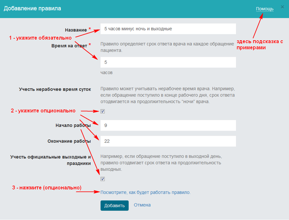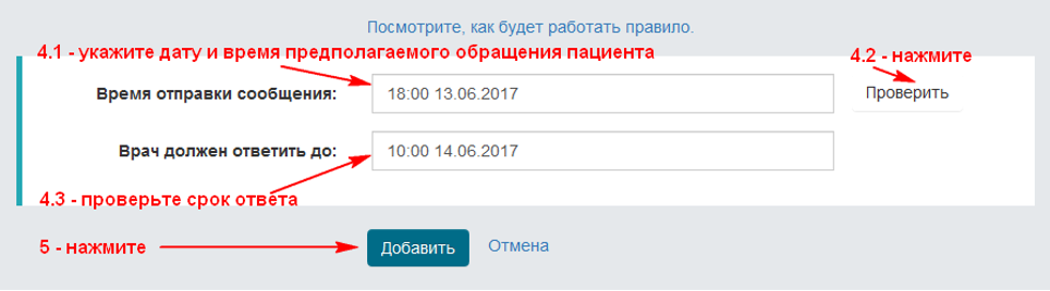 - в следующем поле будет показан срок ответа врача, рассчитанный по указанным параметрам правила; убедитесь, что он соответствует вашим ожиданиям; вы можете попробовать другие даты, например, "пощупать" правило вблизи выходных и т.д.