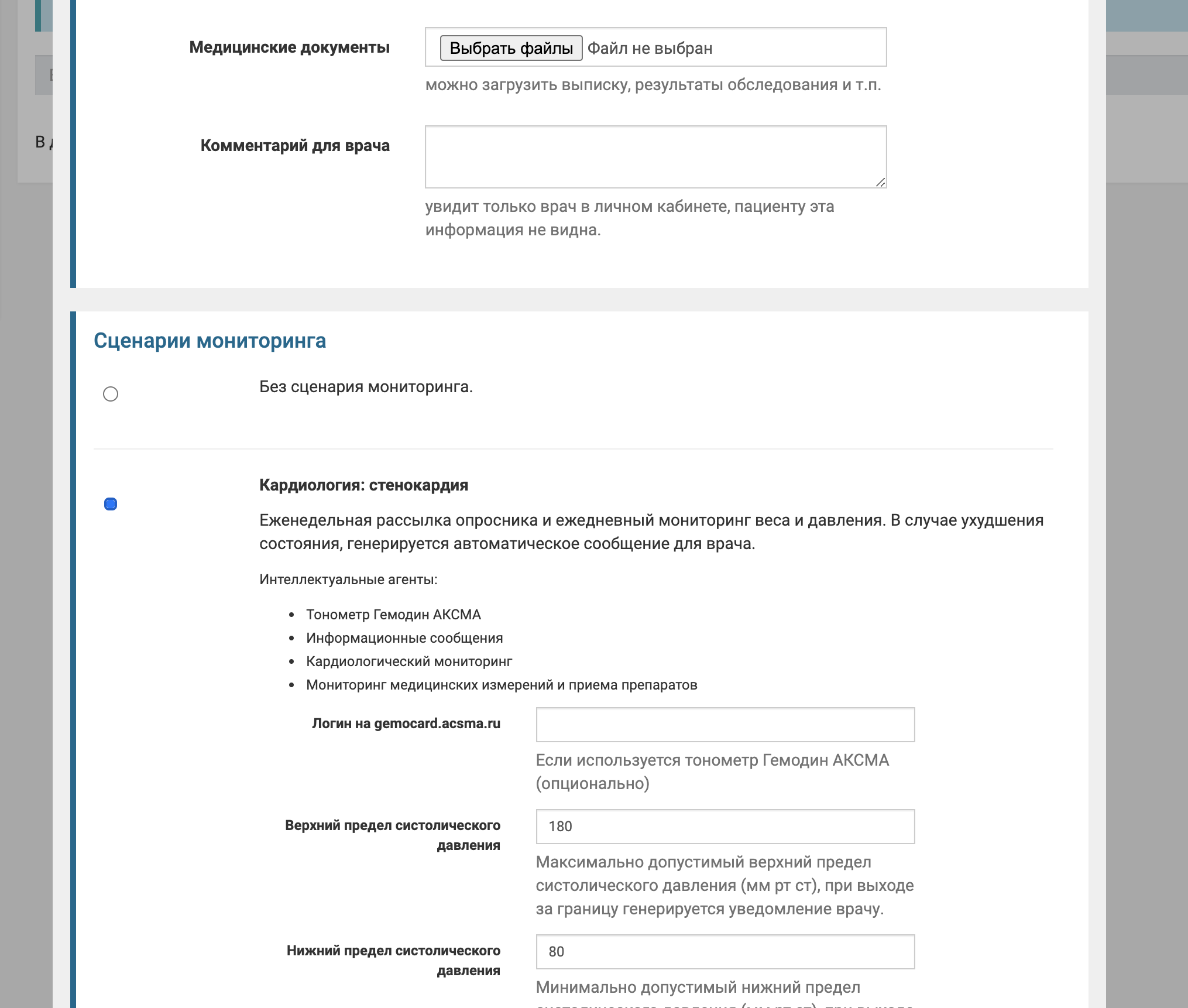 Для подключения сценария, его достаточно выбрать на экране создания контракта и указать обязательные параметры, например, границы давления и пульса для артериальной гипертензии.