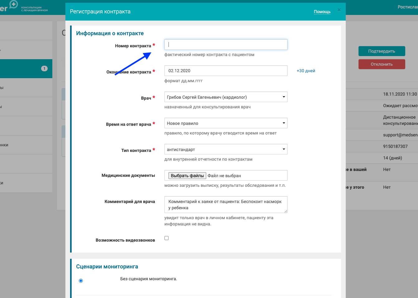 Для подтверждения заявки нажмите на кнопку "Подтвердить". В форме создания контракта врач и дата завершения будут выбраны автоматически (но их можно скорректировать), но вам как минимум потребуется указать номер контракта и проверить правило ответа врача.