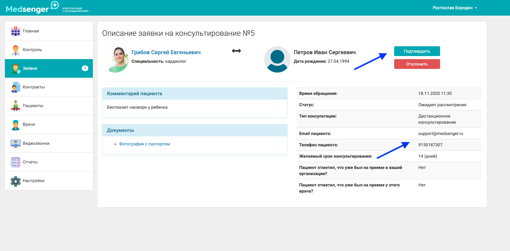 На странице заявки вы сможете скачать приложенные к заявке документы (которые вы запросили в настройках), увидеть выбранного врача, желаемую консультации (контракта), комментарий и информацию о пациенте.