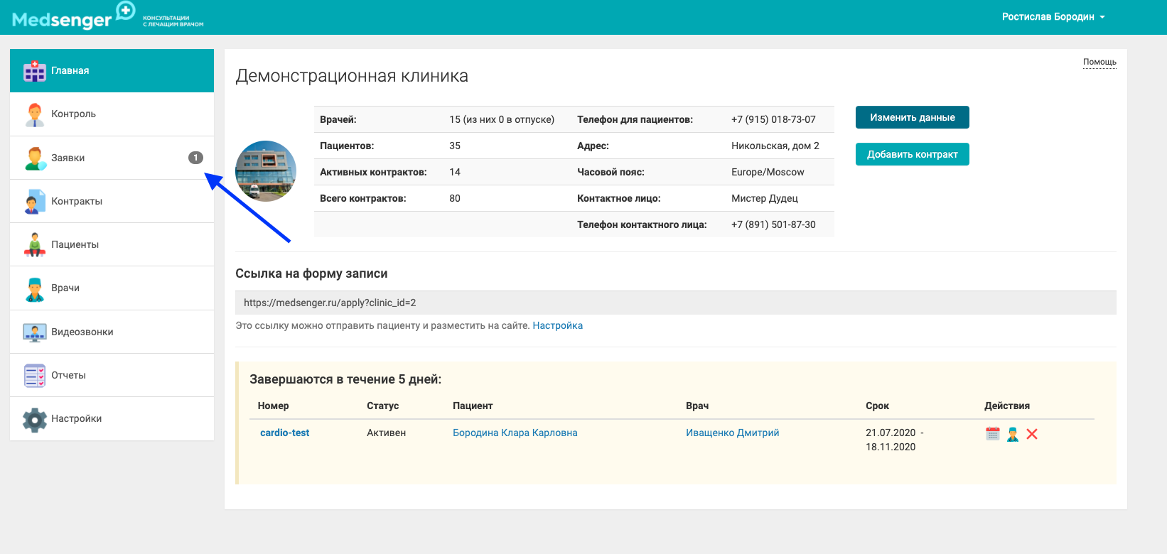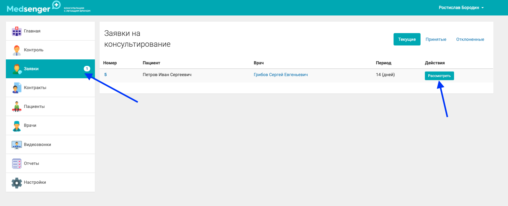Как только пациент отправит заявку на консультирование, все администраторы в вашей медицинской организации получат уведомление на почту, а в меню у пункта "Заявки" появится маркировка с числом необработанных заявок.
