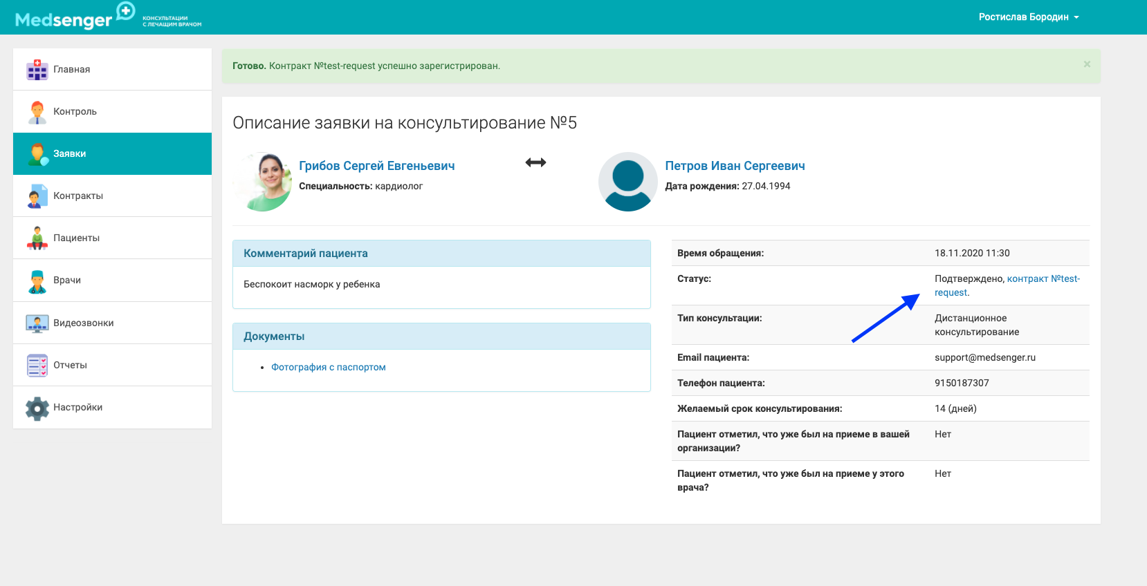 После подтверждения заявка переходит в раздел "Подтвержденные", а в статусе указана ссылка на созданный контракт. Пациент получит стандартные уведомления о создании нового контракта.