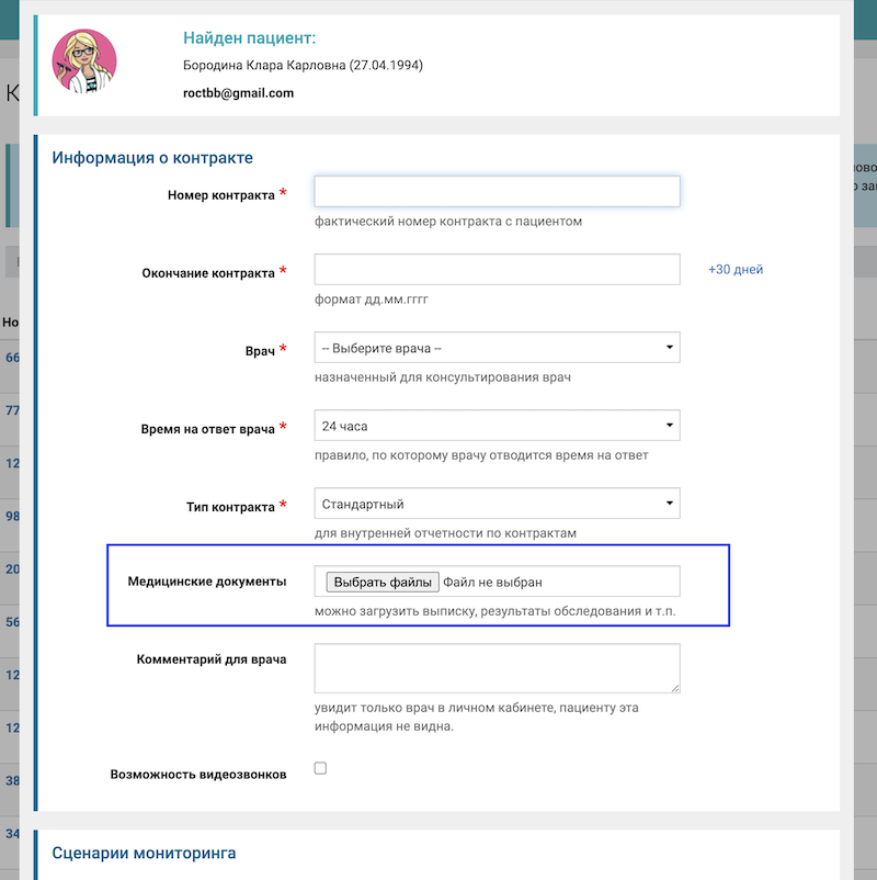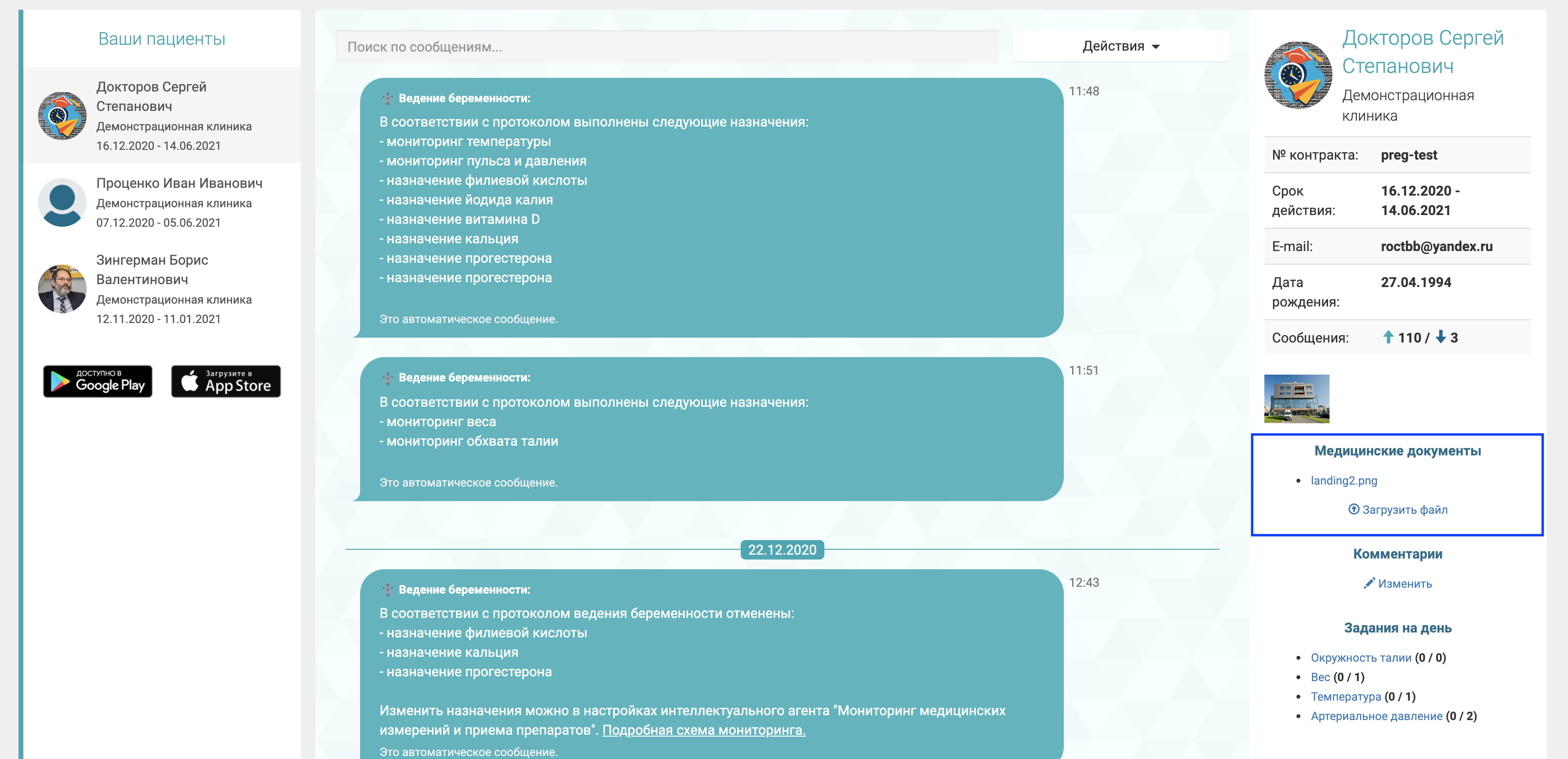 К Medsenger к контракту с пациентом есть возможность приложить файлы (выписку, медицинские документы, результаты анализов), которые будут доступны врача, но не видны пациенту.