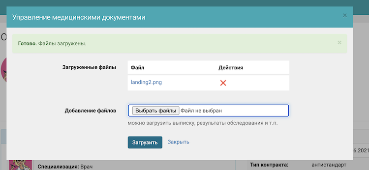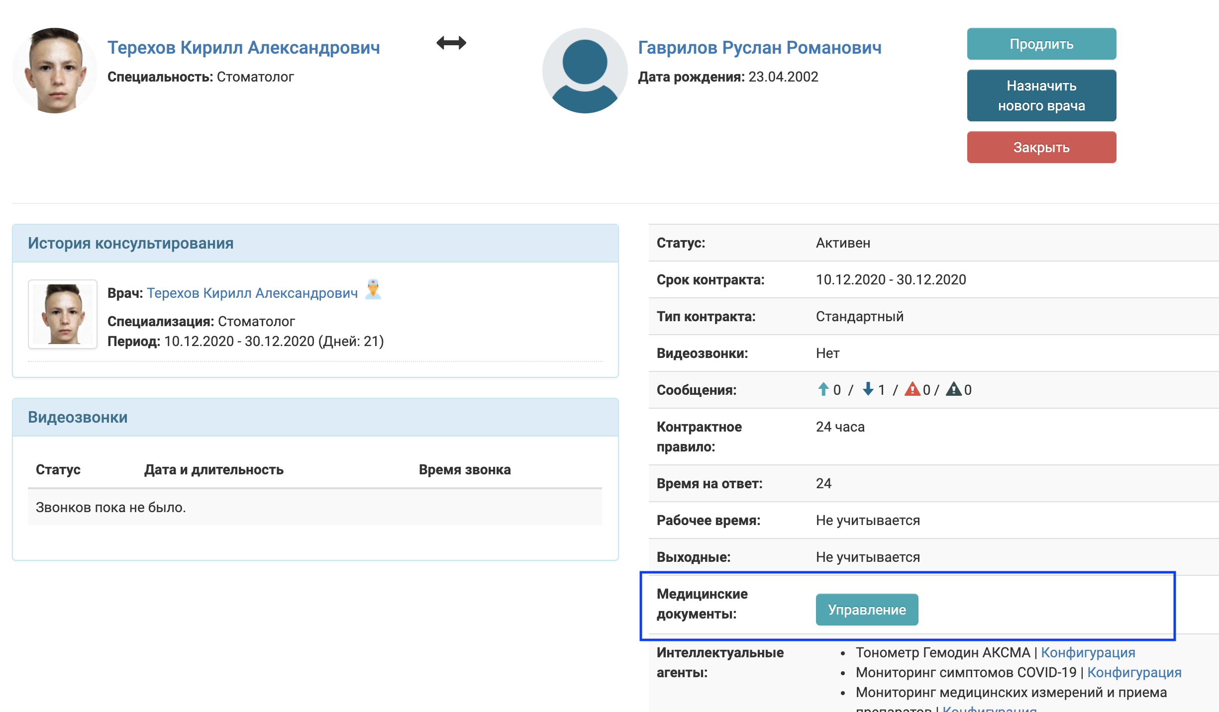 Добавлять такие файлы может как администратор, так и врач. После завершения консультирования документы доступны на странице контракта в архиве (контракты -> архив).