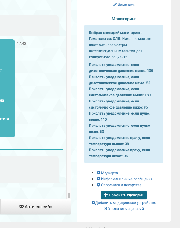 Чтобы настроить параметры мониторинга, нажмите на ссылки "Опросники и лекарства" в списке интеллектуальных агентов.