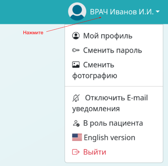 Нажмите на ссылку с ФИО в правом верхнем углу экрана