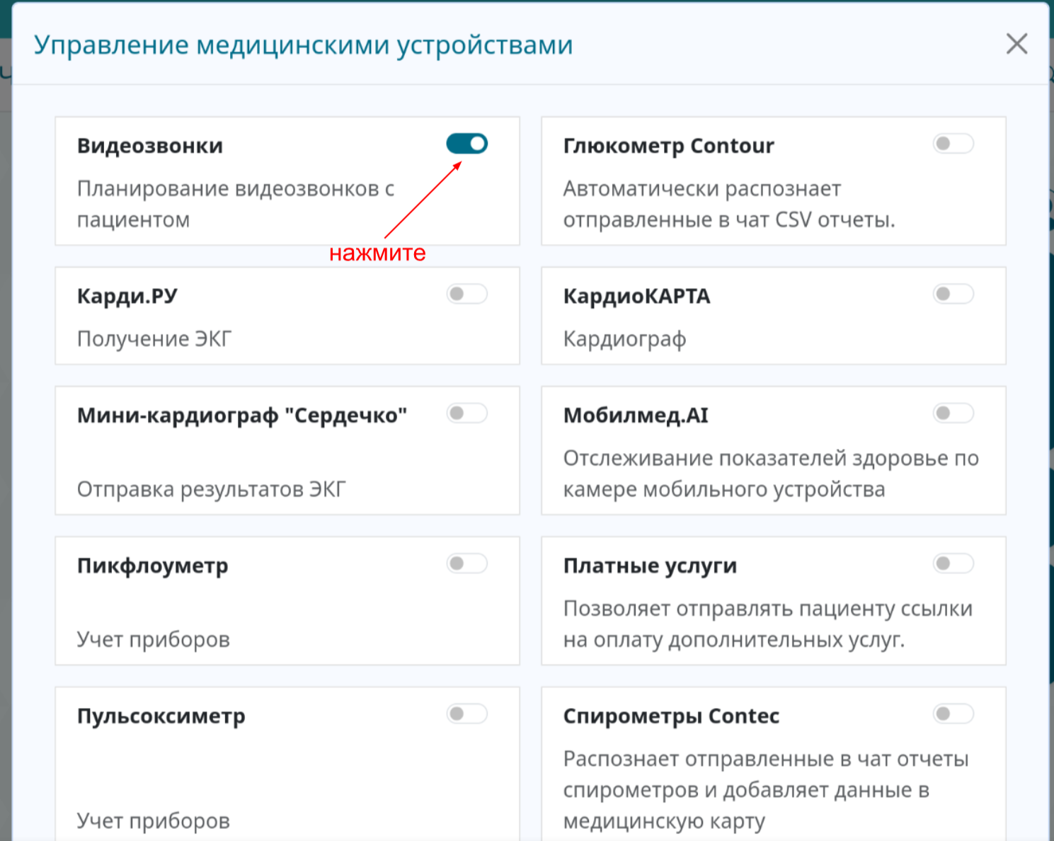 Для проведения видеозвонков с пациентом требуется включить соответствующую опцию в интерфейсе программы.