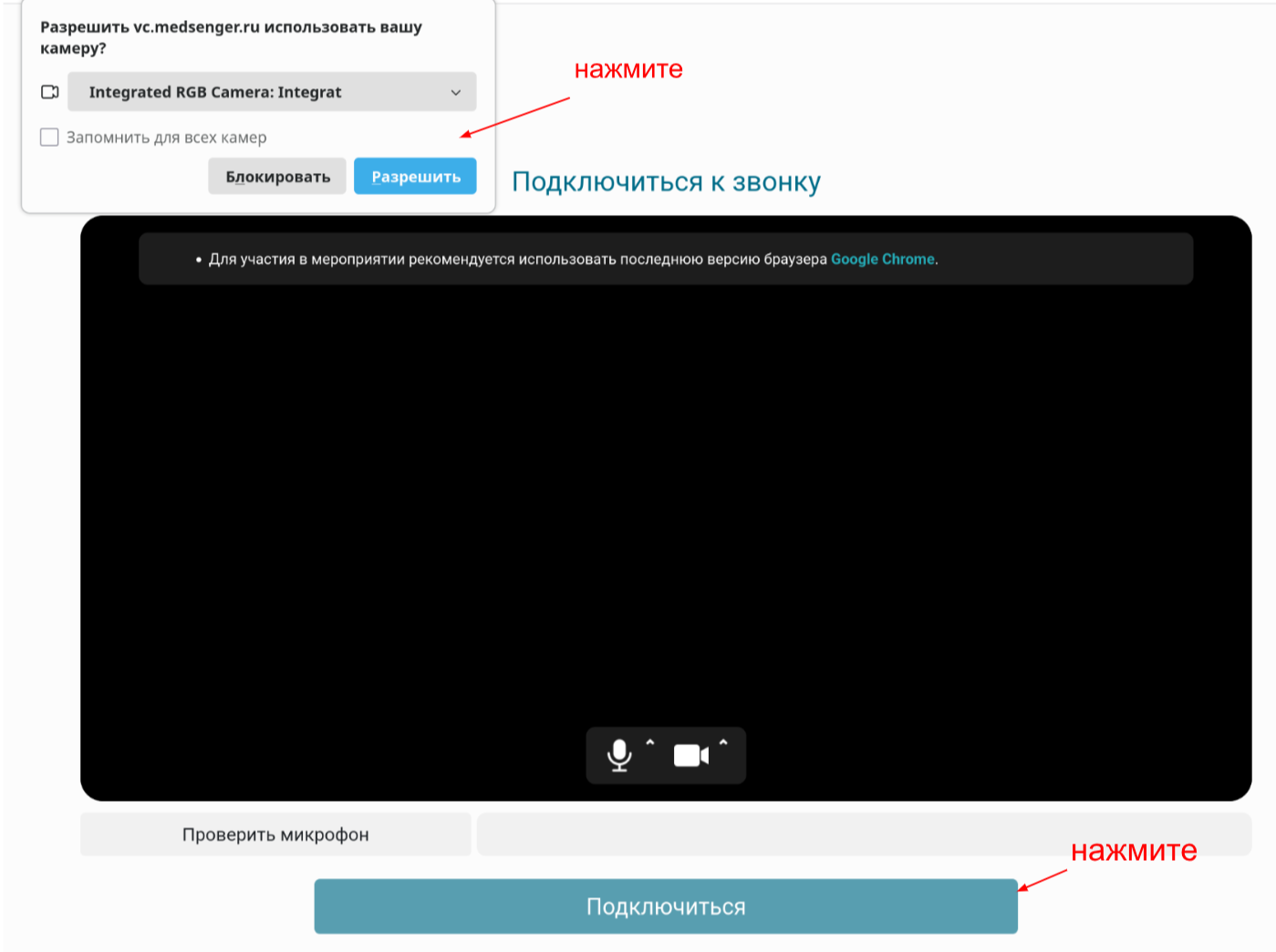 При подключении к видеозвонку требуется выдать разрешение для использование микрофона и камеры на вашем устройстве.