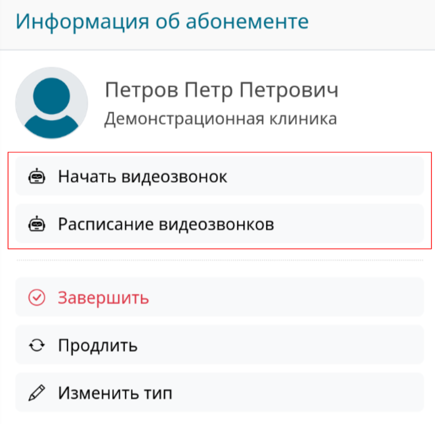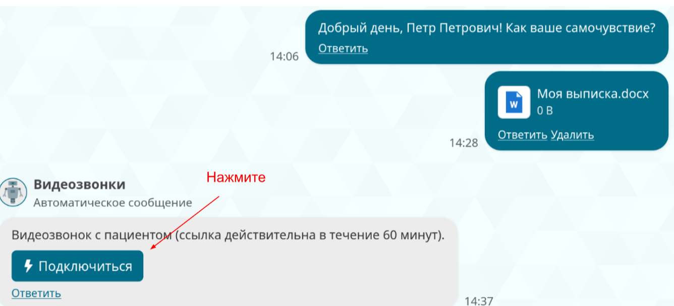 Опция “Начать видеозвонок” сразу создаст кнопку для подключения врача к видеозвонку в чате.